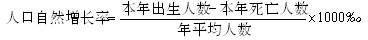 人口自然增长率 指在一定时期内(通常为一年)人口自然增加数(出生人数减死亡人数)与该时期内平均人数(或期中人数)之比,用千分率表示。计算公式为:
