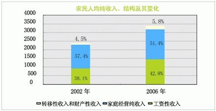 3、发展劳务经济,农民工资性收入大增。全省积极实施“百万培训工程”、“阳光工程”和“双百科技富民工程”,增强农民致富本领,多渠道帮助农民增加务工收入。2006年,农民人均年工资性收入由2002年的914.31元增加到1449.65元,4年增加535.34元,年均增长12.2%。2006年,工资性收入已占到全部纯收入的42.8%,对农民收入增长的贡献率上升到81.2%。